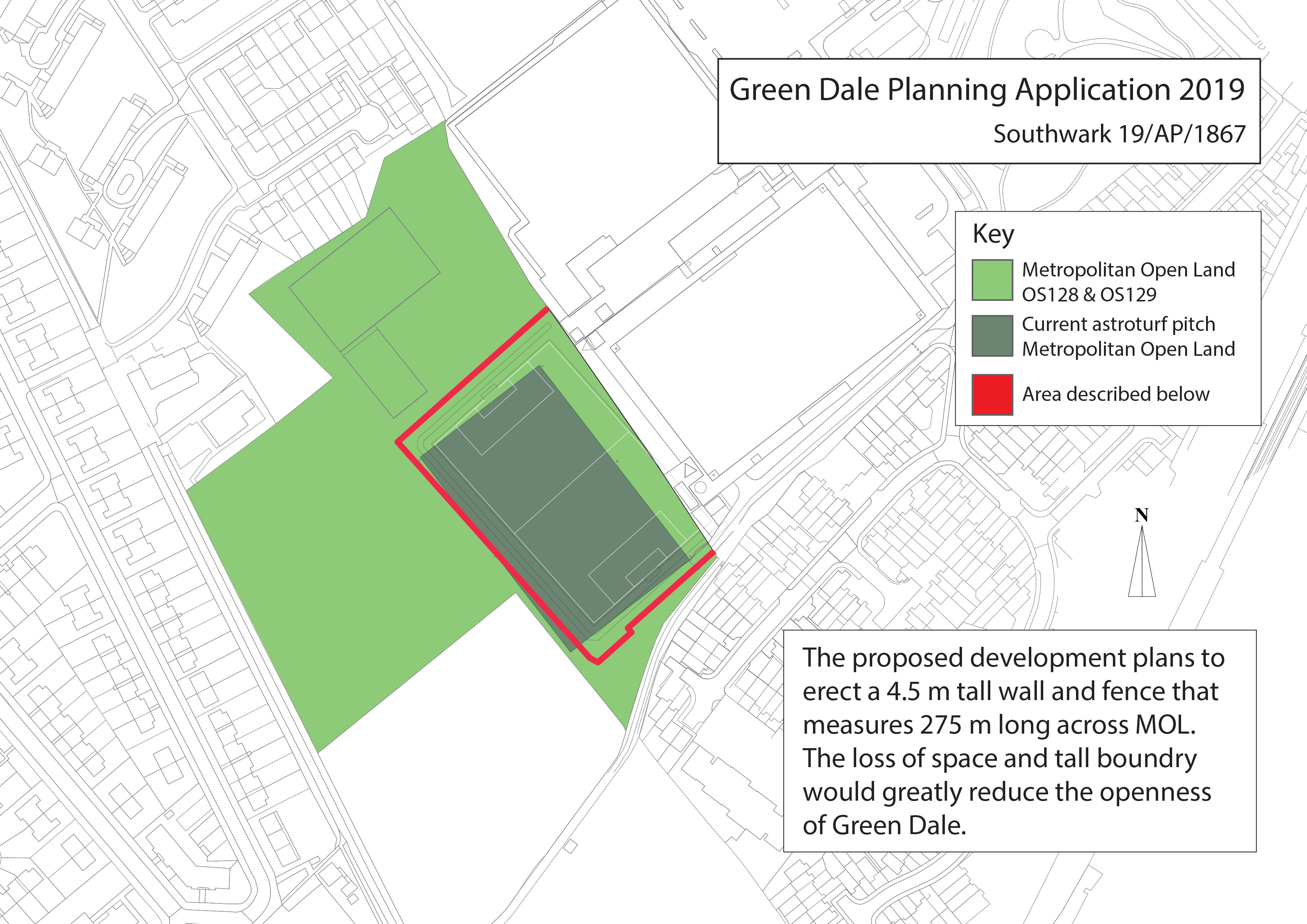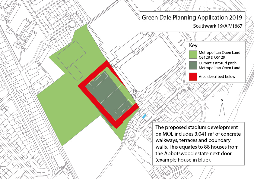 - The location of the new stadium, except for the clubhouse, is on Metropolitan Open Land which is protected under the London Plan (Section 7.17) and Southwark Plan (Policy 3.25). The areas of the new stadium that are on MOL include the 3G pitch (with underground drainage pipes), pitch over-run, crash barrier, concrete terraces, concrete concourse and fencing. These do not constitute an essential ancillary facility nor do they maintain the openness of MOL due to its enclosing wall. It would therefore be a departure from both the Southwark and London Plans.