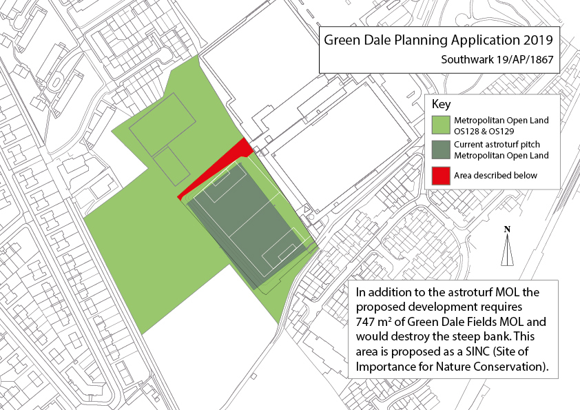 - The proposed stadium would require building on 747 m2 of proposed SINC (Site of Importance for Nature Conservation) at Green Dale Fields OS128. This SINC site has been proposed in the New Southwark Plan. In their report dated 17/12/2015 The Ecology Consultancy recommended that Green Dale Playing Fields OS128 become a SINC because “A number of Southwark BAP species have been recorded on site including hedgehog, stag beetle, common frog and house sparrow…The site probably offers one of the few remaining accessible areas of natural habitat in the local area as most nearby open spaces are managed for amenity and recreation”. The London Plan (Policy 7.19) states that new developments should “wherever possible, make a positive contribution to the protection, enhancement, creation and management of biodiversity”. Building on an area that meets SINC status contravenes this policy.